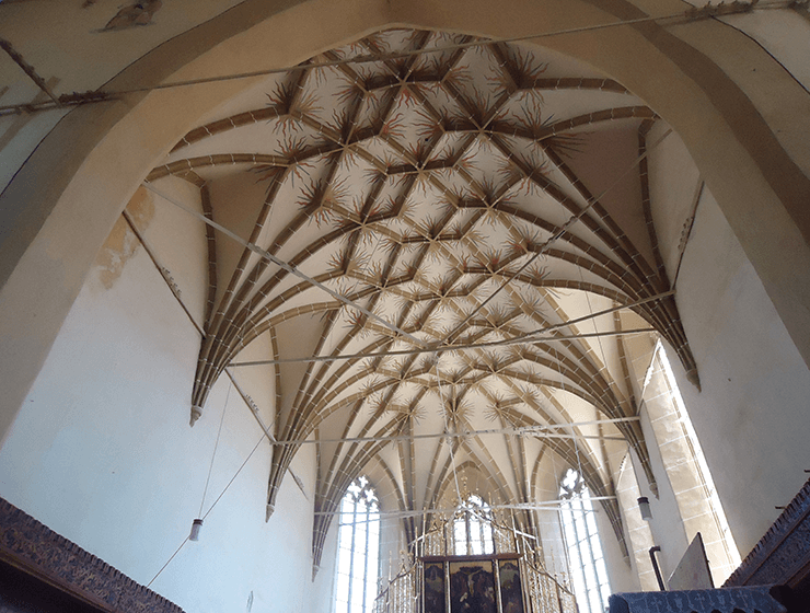 Biserica în stil gotic târziu, a fost limitată de configurația terenului pe care a fost construită. I s-a construit un cor de 18 metri lungime, bolțit cu o rețea de nervuri abia după ce navele vechiului edificiu au fost înlocuite cu trei nave de înălțime egală, bolțite deasemeni cu bolți în rețea.