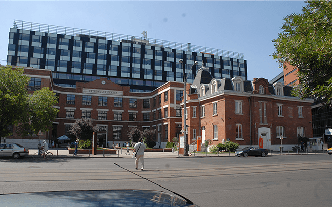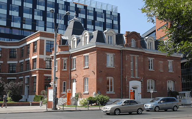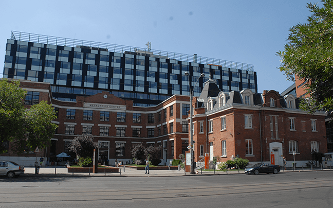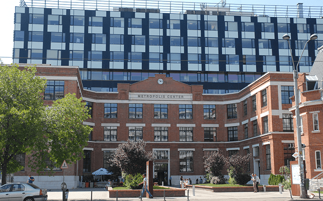 Se remarcă contrastul între fațada istorică și fațada de sticlă a noii clădiri. Iluminatul nocturn favorizează acest contrast punând însă în valoare ambele componente.